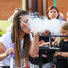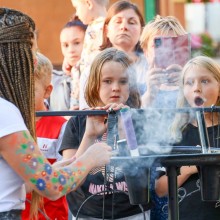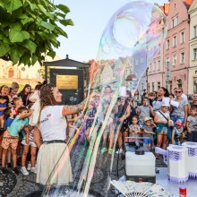 Agata Nikodem przygotowała dla dzieci i ich opiekunów prawie półgodzinny występ z motywem Krainy Lodu. Były duże, małe i całkiem maleńkie bańki mydlane oraz takie szare, które po rozbiciu zamieniały się w mgiełkę. Dzieci żywiołowo zachwycały się pokazem, a pani Agata, jak wróżka z bajki, czarowała kolejne piękne i kruche mydlane cudeńka.