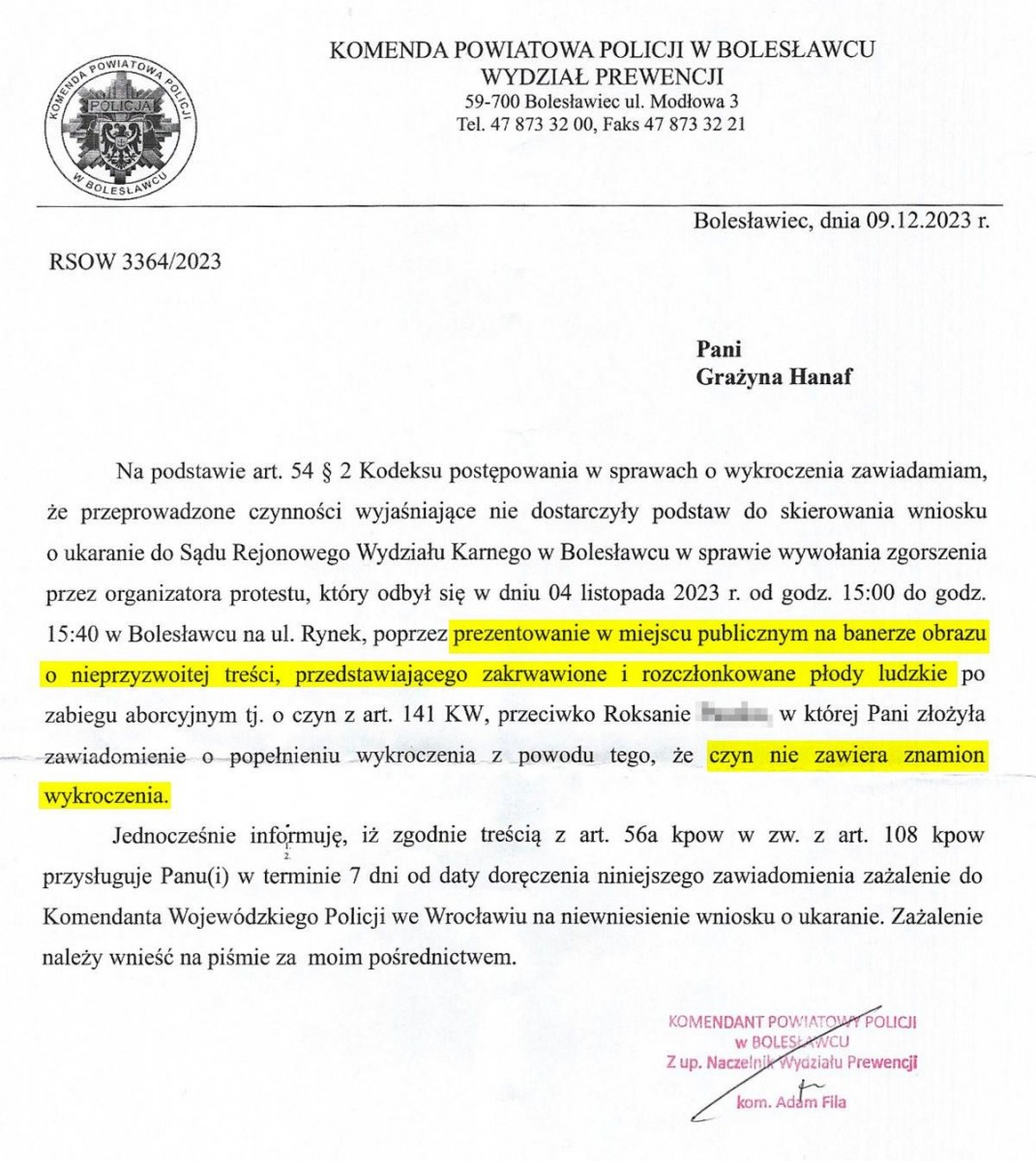 Choć baner epatuje przechodniów makabrycznością, to naczelnik wydziału prewencji bolesławieckiej policji kom. Adam Fila uznał, że pokazywanie tego baneru nie zawiera znamion wykroczenia o którym mowa w art. 141 Kodeksu wykroczeń.