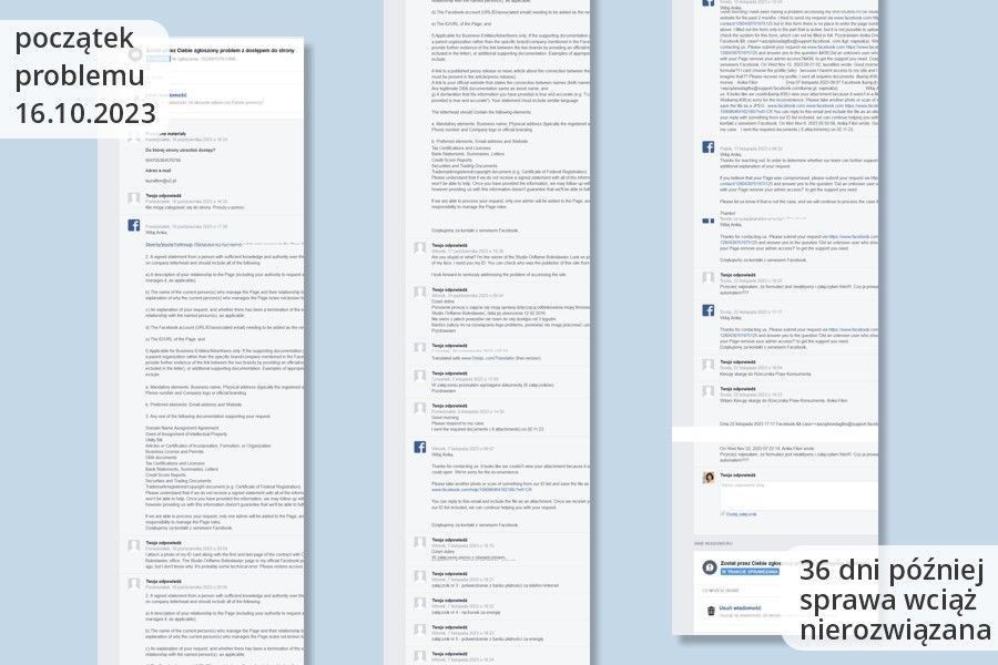 Choć na przejętej firmowej stronie wciąż były obecne zdjęcia twarzy Aniki Fiłon z prywatnego profilu oraz fotografie jej bolesławieckiego biura, to facebook zażądał skanów różnych dokumentów. W toku długiej korespondencji z facebookiem Anika Fiłon wysłała kopie wpisu do Centralnej Ewidencji i Informacji o Działalności Gospodarczej, umowy z Oriflame, skany dowodu osobistego itp.