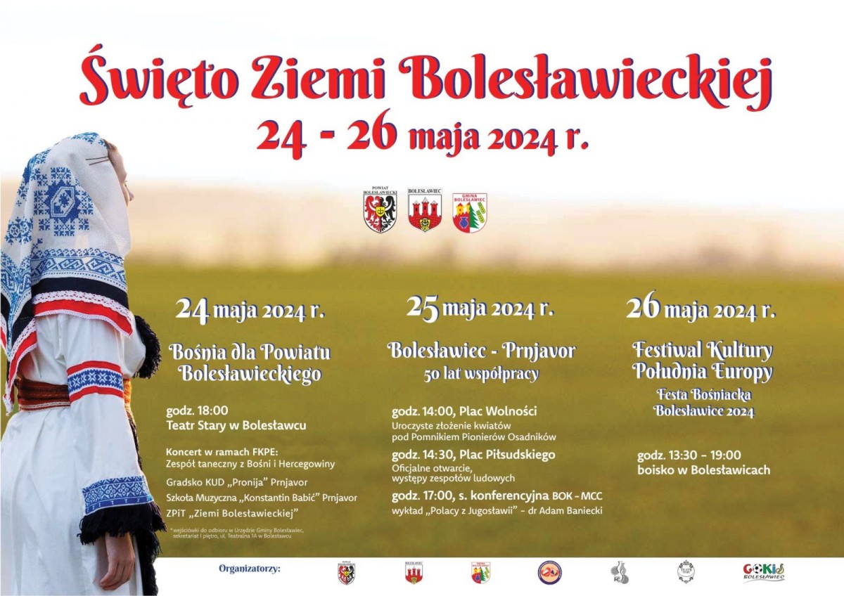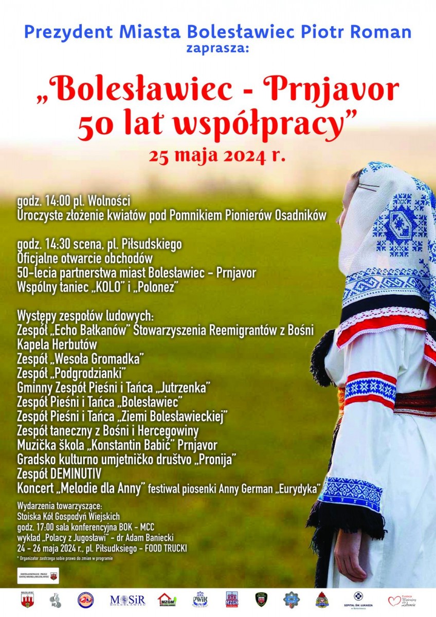 25 maja (sobota) 25 maja (sobota) odbędą się plenerowe uroczystości z okazji 50-lecia współpracy Bolesławca z Prnjavorem. Uroczystości otworzy złożenie kwiatów pod Pomnikiem Pionierów Osadników o godzinie 14.00 Następnie na pl. Piłsudskiego przed siedzibą BOK-MCC od godziny 14.30 czekać będą na Państwa liczne atrakcje kulturalne i kulinarne. Szczegóły na plakacie.