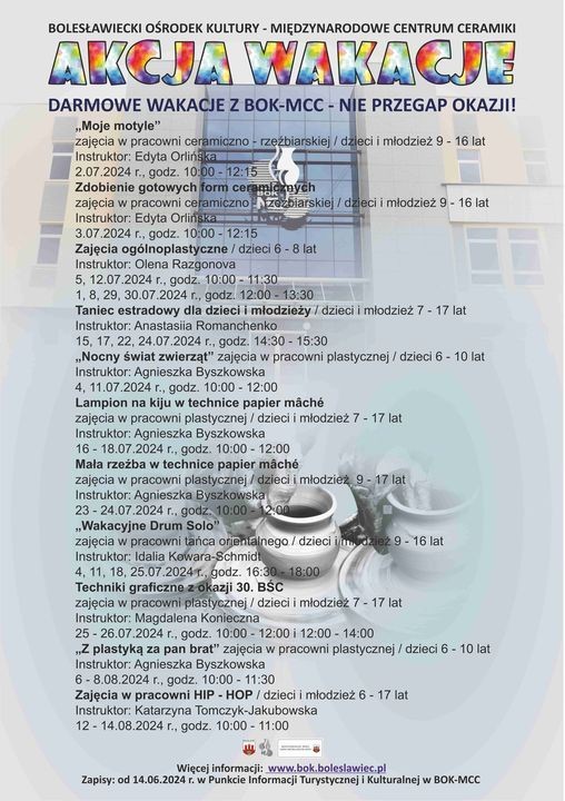 Wakacje to doskonały czas, aby rozwijać swoje pasje, zdobywać nowe umiejętności, na które nie było czasu w roku szkolnym. Bolesławiecki Ośrodek Kultury – Międzynarodowe Centrum Ceramiki zaprasza wszystkich entuzjastów sztuk wszelakich i aktywnego spędzania czasu na unikalne zajęcia wakacyjne, które pozwolą odkryć ukryte talenty i rozwijać artystyczną wrażliwość.
