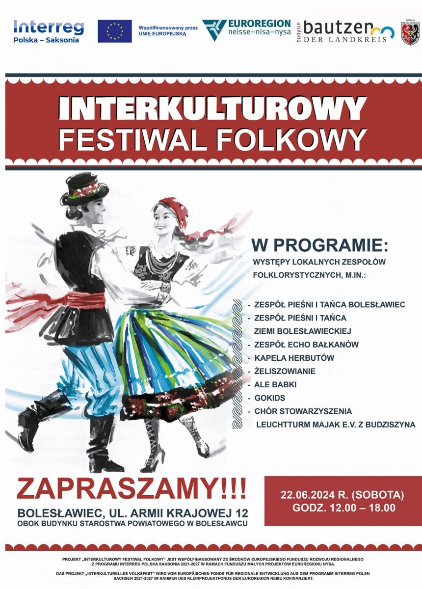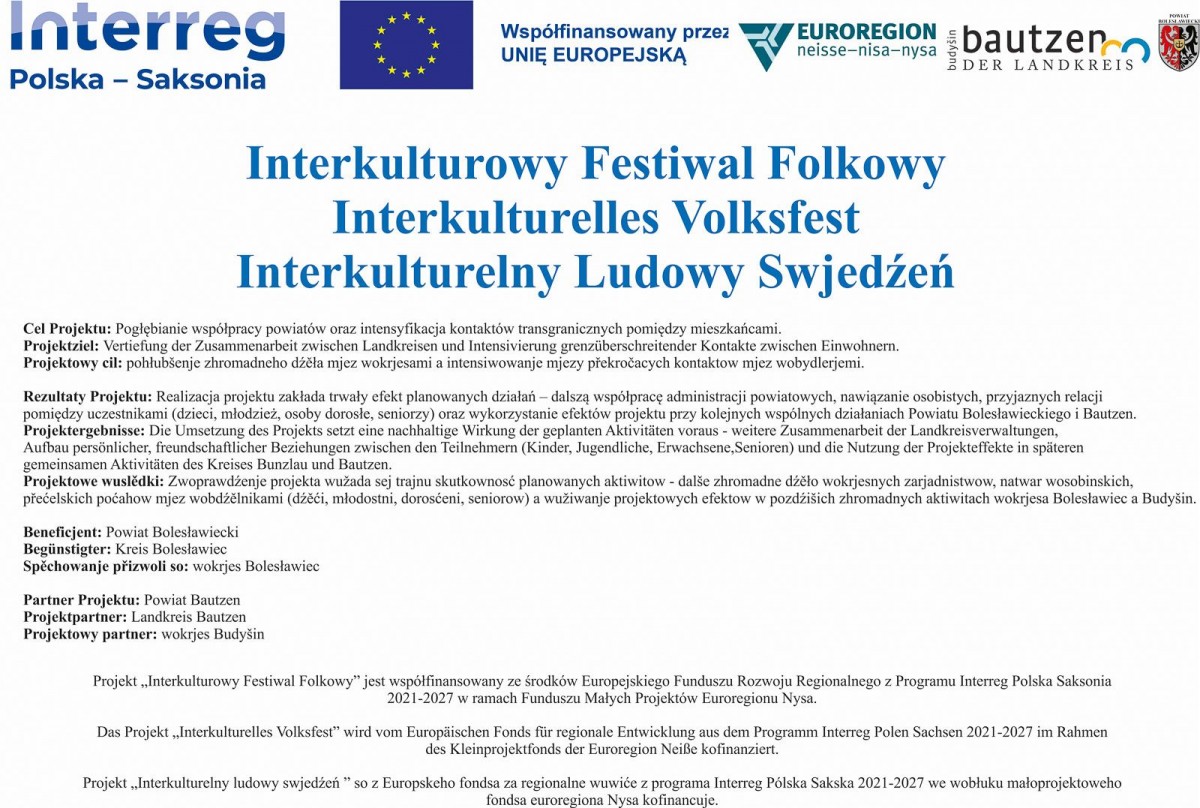 Projekt „Interkulturowy Festiwal Folkowy” jest współfinansowany ze środków Europejskiego Funduszu Rozwoju Regionalnego z Programu Interreg Polska Saksonia 2021-2027 w ramach Funduszu Małych Projektów Euroregionu Nysa.