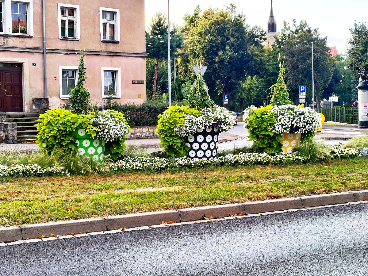 Tymczasem na nietypowym skrzyżowaniu w Bolesławcu pojawiły się dekoracje w postaci dużych donic z kwiatami.