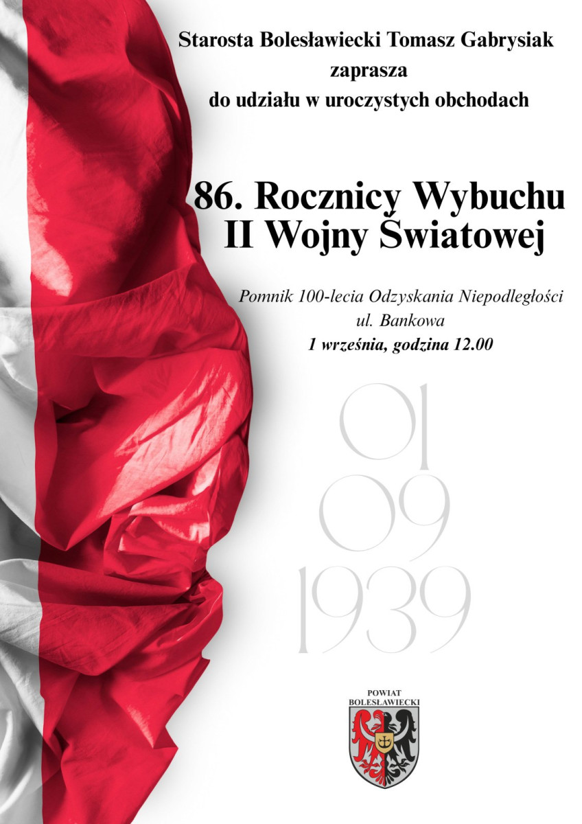 Starosta Bolesławiecki Tomasz Gabrysiak zaprasza do uczestnictwa a obchodach 86. Rocznicy Wybuchu II Wojny Światowej.