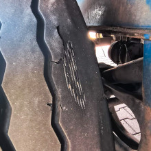 Podczas szczegółowych oględzin stwierdzono uszkodzenia opon na dwóch osiach naczepy – bieżniki miały głębokie nacięcia, a w kilku miejscach widoczny był stalowy kord. Tego typu usterki, zgodnie z obowiązującymi przepisami, zostały zakwalifikowane jako niebezpieczne i stanowiły realne zagrożenie w ruchu drogowym.