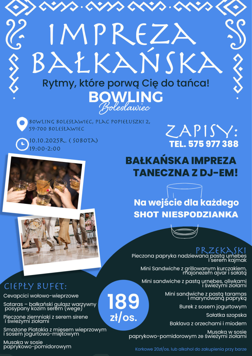10 października 2025 roku w Bowling Bolesławiec odbędzie się Bałkańska Impreza – rytmy, które porwą do tańca, która przeniesie nas wprost do serca Bałkanów – krainy pełnej temperamentu, muzyki i smaków, które rozpalają... ZMYSŁY.
