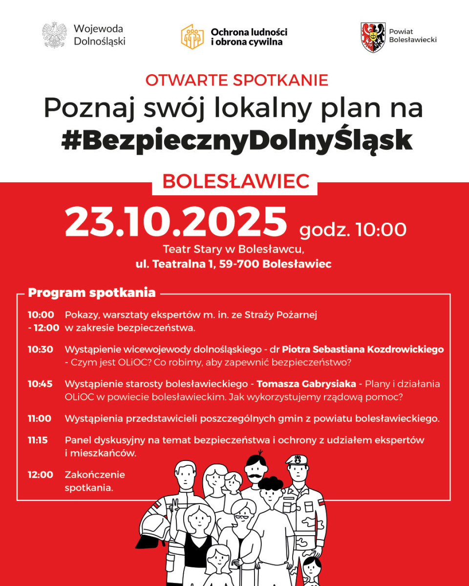 Wojewoda Dolnośląski, Ochrona ludności i obrona cywilna oraz Powiat Bolesławiecki zapraszają na OTWARTE SPOTKANIE „Poznaj swój lokalny plan na #BezpiecznyDolnyŚląsk”, które odbędzie się 23 października (czwartek) w Teatrze Starym w Bolesławcu (ul. Teatralna 1). Początek o 10:00.