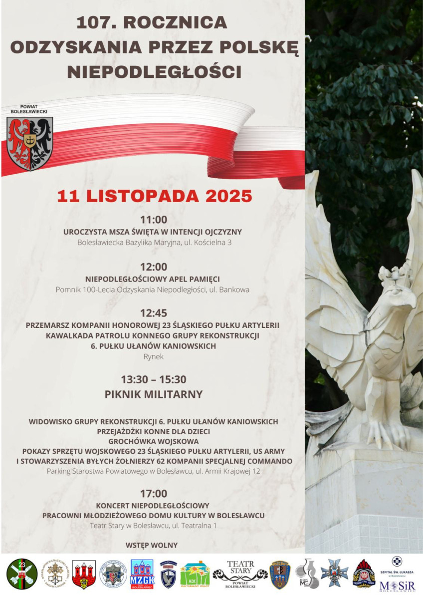 Uroczystości rozpoczną się o godz. 11:00 mszą świętą w intencji Ojczyzny w Bolesławieckiej Bazylice Maryjnej przy ul. Kościelnej 3. Następnie, o godz. 12:00, pod Pomnikiem 100-lecia Odzyskania Niepodległości przy ul. Bankowej, odbędzie się Niepodległościowy Apel Pamięci z udziałem przedstawicieli władz, służb mundurowych i mieszkańców powiatu.