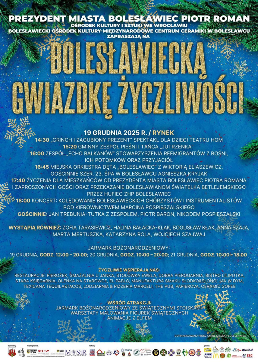 Jarmark Bożonarodzeniowy: 19 grudnia, godz. 12:00 – 20:00; 20 grudnia, godz. 10:00 – 20:00; 21 grudnia, godz. 10:00 – 18:00