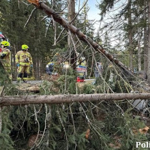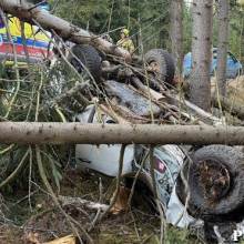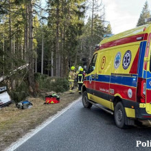 40-letni obywatel Niemiec, kierujący Toyotą, przewożąc czterech pasażerów, podczas manewru wyprzedzania wpadł w poślizg na oblodzonej nawierzchni, wypadł z drogi do lasu, ściął dwa świerki i dachował.