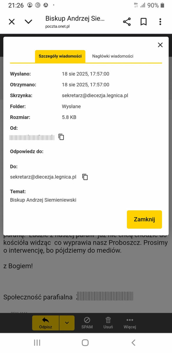 W sierpniu 2025 roku mieszkańcy jednej z parafii diecezji legnickiej wysłali do biskupa Andrzeja Siemieniewskiego maila z opisem relacji ich proboszcza z kobietą. Nie doczekali się jednak odpowiedzi. Ponowili korespondencję w październiku. I znów, jak twierdzą, bez odzewu ze strony Kurii Legnickiej.
