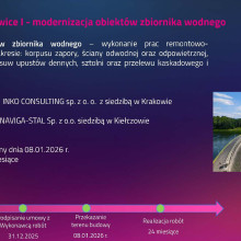Już w maju 2027 roku zbiornik ponownie zostanie całkowicie opróżniony, aby możliwe było prowadzenie robót w sztolni obiegowej pod osłoną grodzy z kontenerów. Zakończenie zasadniczych prac remontowych planowane jest na początek stycznia 2028 roku, natomiast pełne napełnienie zbiornika do optymalnych warunków eksploatacyjnych ma nastąpić w marcu 2028 roku.