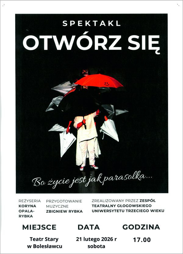 Przedstawienie przygotowane zostało przez aktorów Głogowskiego Uniwersytetu Trzeciego Wieku i stanowi poruszającą, plastyczną opowieść o ludzkim życiu, którego metaforą jest parasolka. Tak jak ona – otwieramy się i zamykamy pod wpływem różnych doświadczeń, emocji i spotkań. To historia o nas samych, opowiedziana bez słów, które tak często nadużywamy w codzienności.