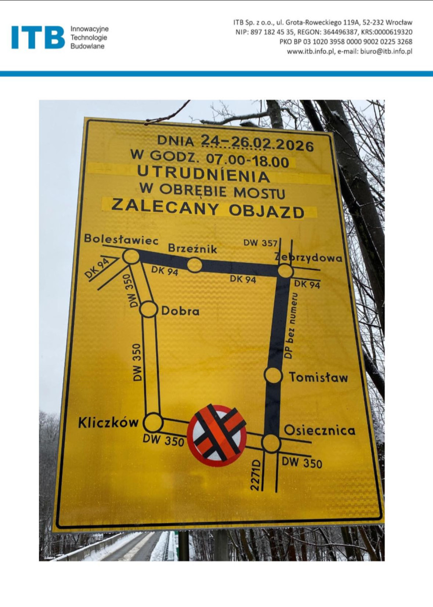 Zalecamy, aby w tych dniach kierowcy wybrali alternatywne trasy poruszania się na kierunku Osiecznica–Bolesławiec. Odpowiednie oznakowanie zostało zamontowane w obrębie mostu.