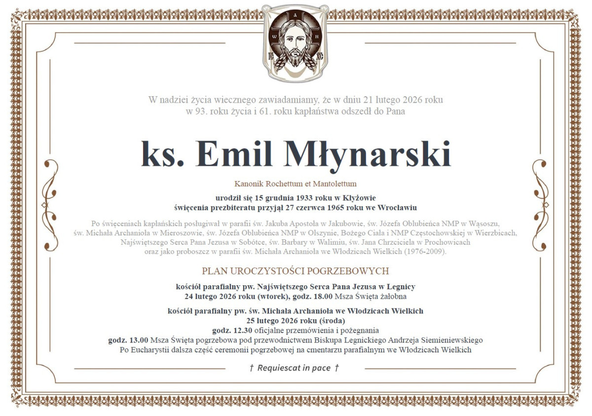 Msza św. pogrzebowa zaś będzie mieć miejsce w środę, 25 lutego w Kościele Parafialnym pw. św. Michała Archanioła we Włodzicach Wielkich. Początek o 13:00. Wcześniej, o 12:30, zaplanowano oficjalne przemówienia i pożegnania.