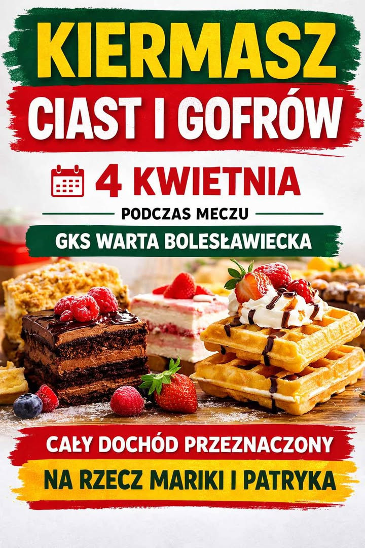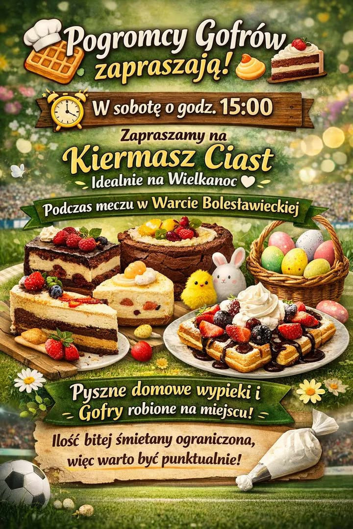 Pogromcy Gofrów zapraszają w tę sobotę, 4 kwietnia, o godzinie 15:00, na Kiermasz Ciast, który odbędzie się podczas meczu w Warcie Bolesławieckiej. Będą pyszne domowe wypieki i gofry robione na miejscu!