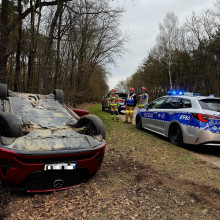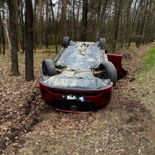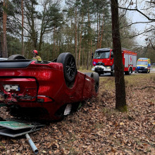 Na miejscu strażacy zastali samochód osobowy marki Mazda, który dachował i wypadł z jezdni. Rzecznik: – Kierujący Mazdą opuścił pojazd o własnych siłach przed przybyciem służb ratunkowych.