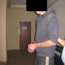 Policjanci przed budynkiem, gdzie znaleziono zwłoki kobiety