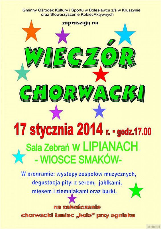 Gminny Ośrodek Kultury i Sportu w Bolesławcu z/s w Kruszynie oraz Stowarzyszenie Kobiet Aktywnych zapraszają na Wieczór Chorwacki, który odbędzie się 17 stycznia w Lipianach (Gmina Wiejska Bolesławiec). Początek o 17:00. Wstęp wolny.